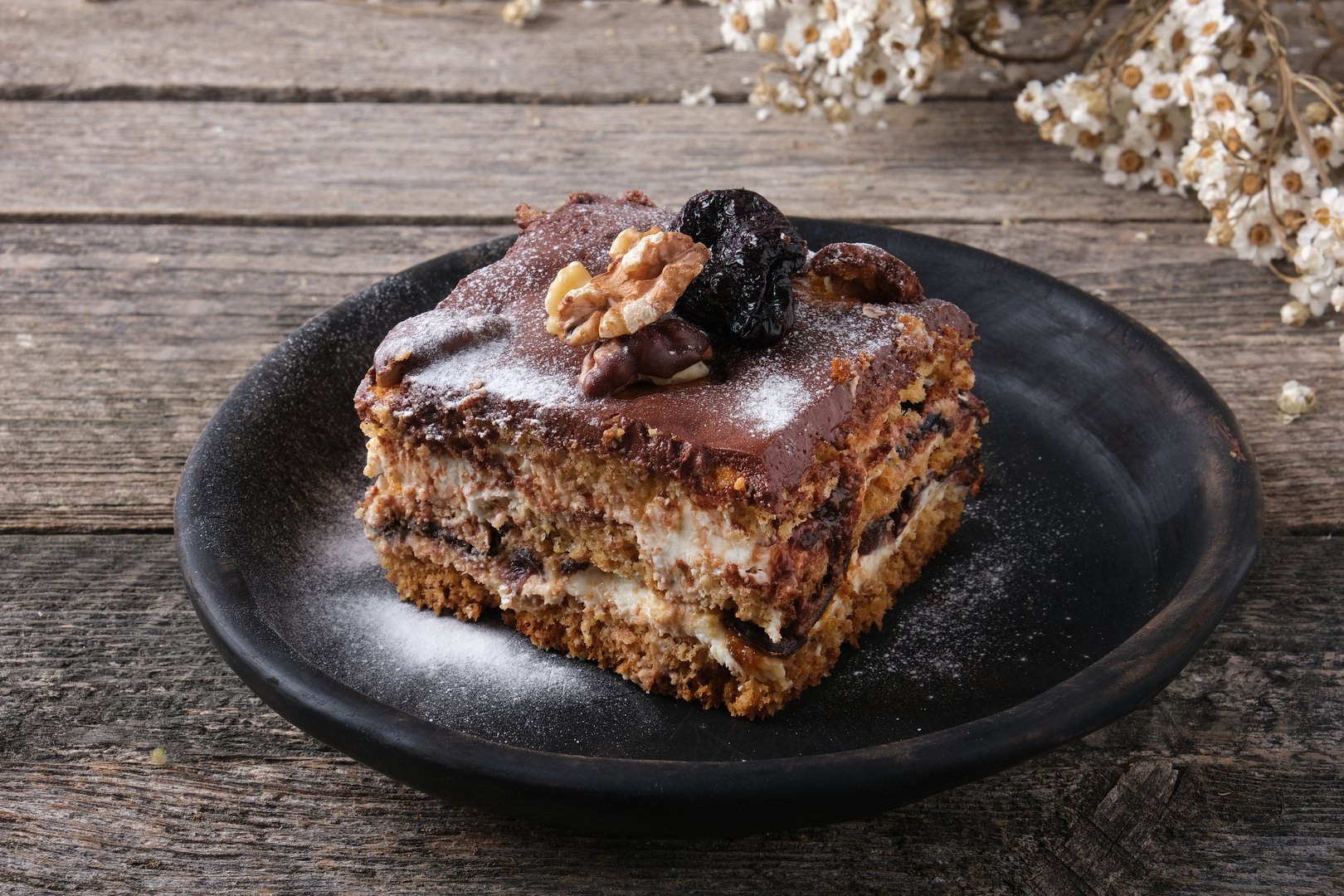 блинчики мучные, чернослив, грецкий орех, мед, ликер - крем, топинг Шоколад, декор