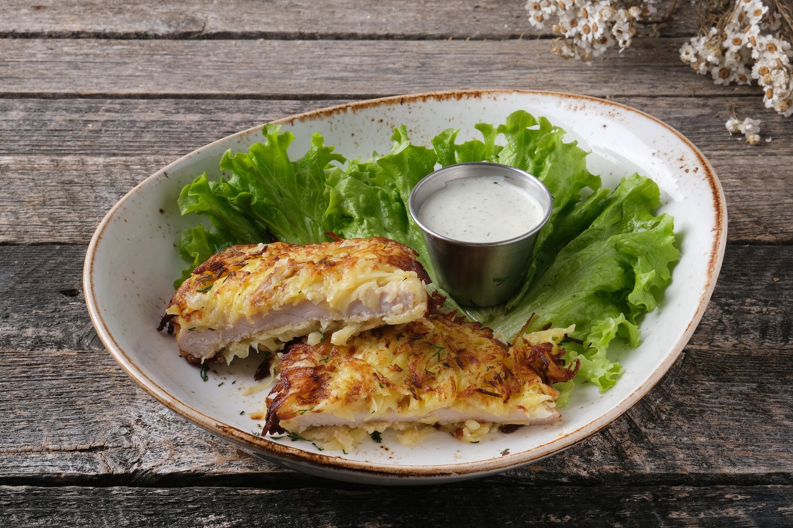 филей свиной, яйцо куриное, мука пшеничная, картофель, масло сливочное СОУС ЧЕСНОЧНЫЙ: сметана, майонез, огурчики-корнишоны, сок лимона, чеснок, укроп