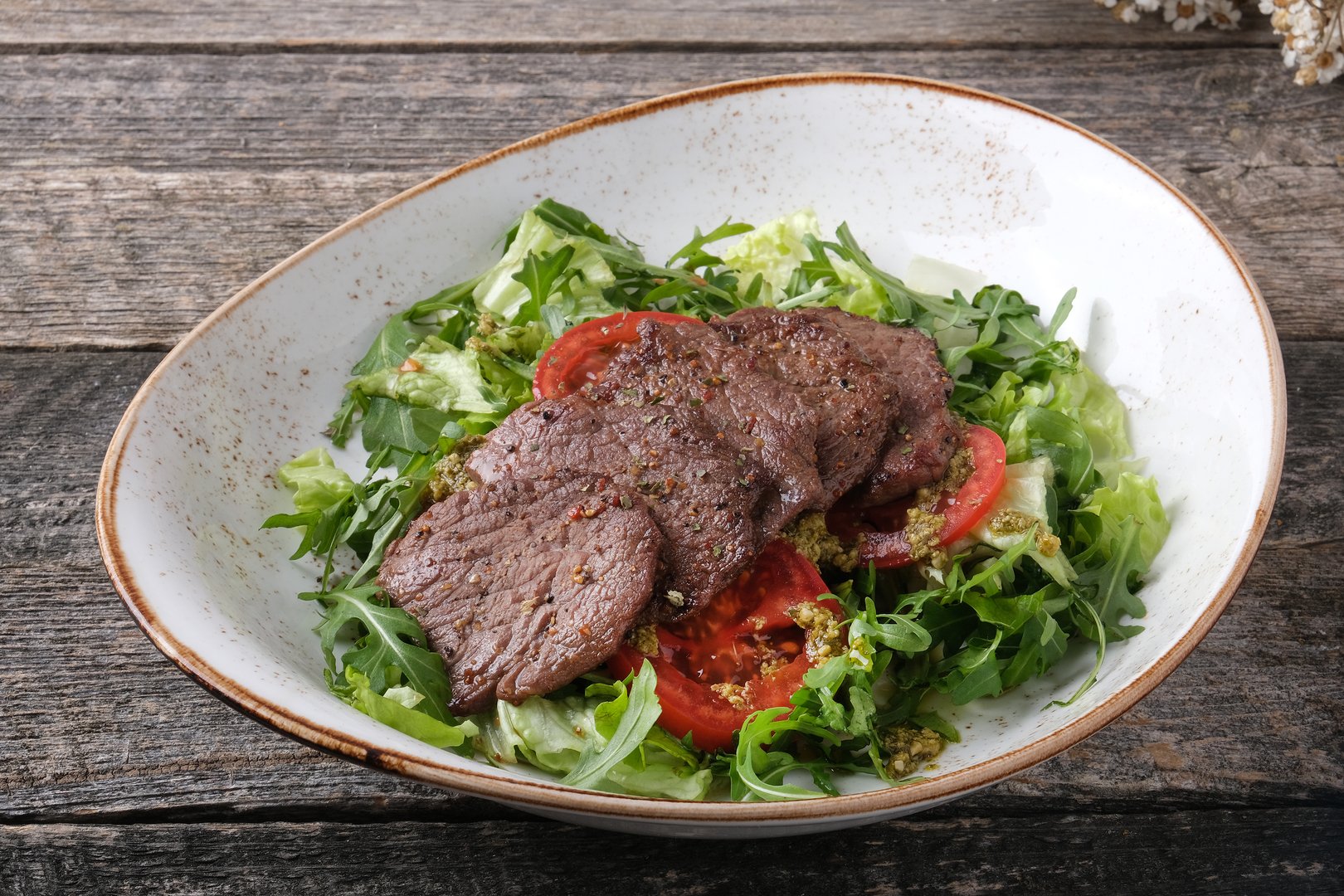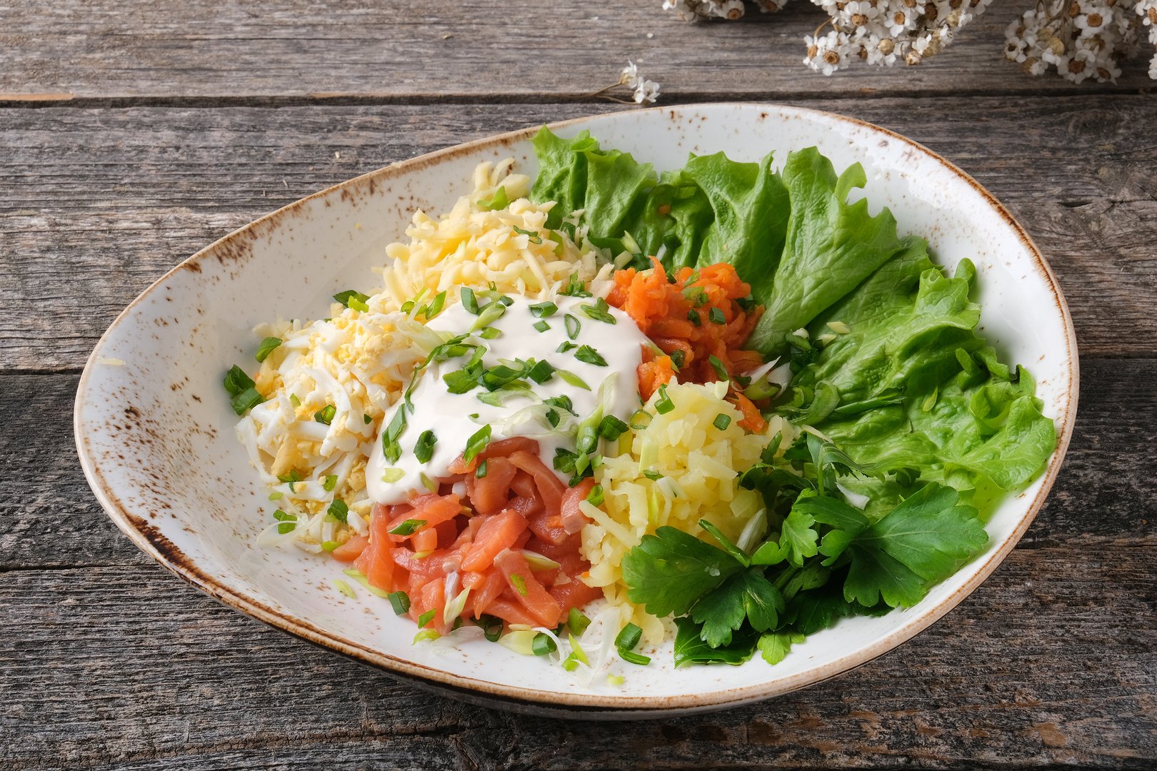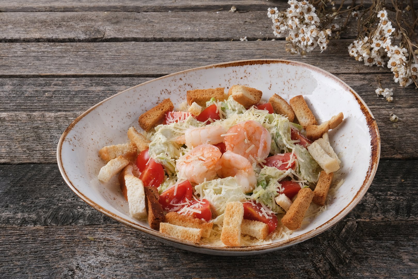 мясо кальмара, мясо креветки, чеснок, масло растительное, микс свежих салатов, перец сладкий свежий, сельдерей стеблевой, томат Черри, оливки, сыр твердый выдержанный, ЗАПРАВКА: масло оливковое, соевый соус, горчица столовая, горчица Французская, мед, уксус винный Бальзамический