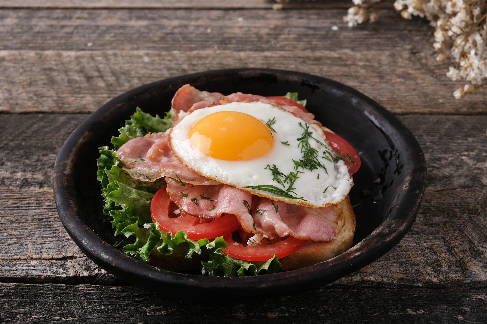 яйцо куриное, балык в/к, помидоры свежие, сыр сычужный, масло раст., микс салатов, зелень
