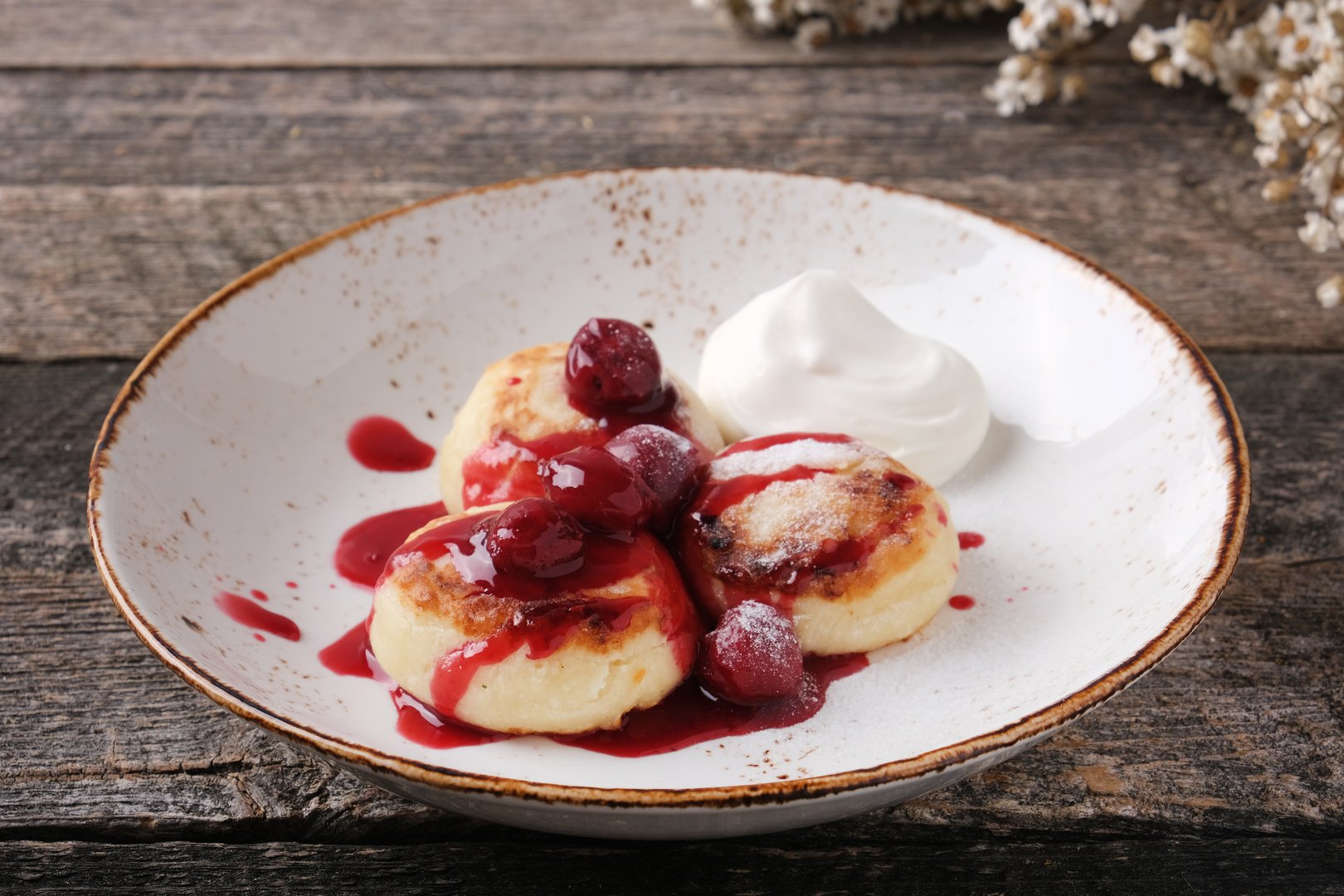 творог, яйцо куриное, сахар, мука пшеничная, ваниль, масло растительное, сахарная пудра, вишня, сметана