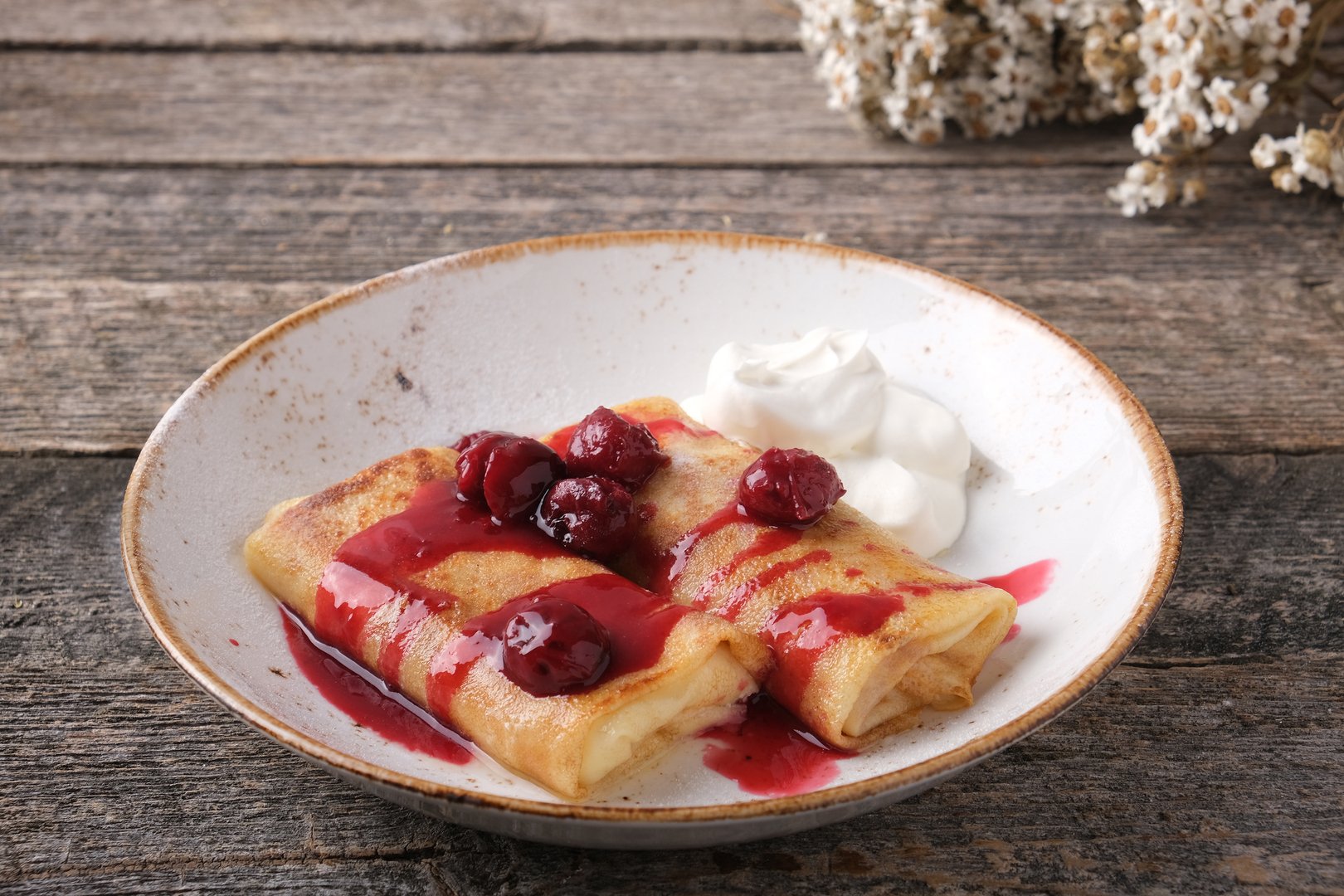 блинчики тонкие мучные, творог, сметана, сахар, масло сливочное, сахарная пудра, вишня, сметана