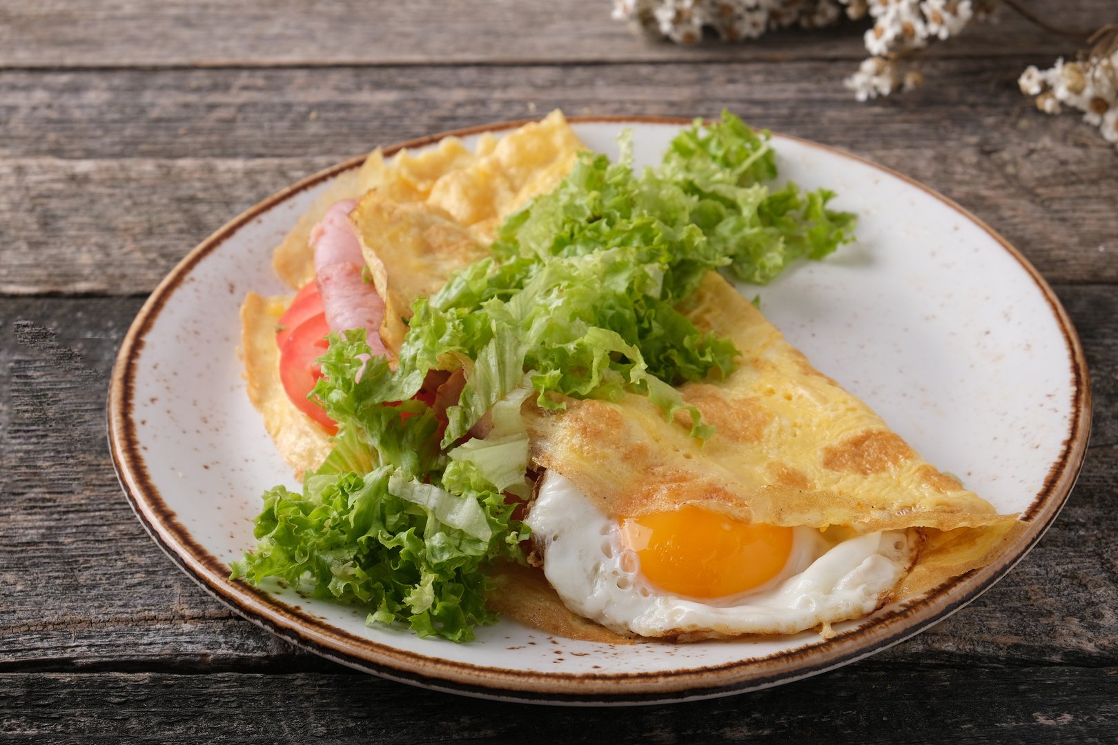 блинчики тонкие мучные, балык в/к, сыр сычужный, масло сливочное, салат, зелень