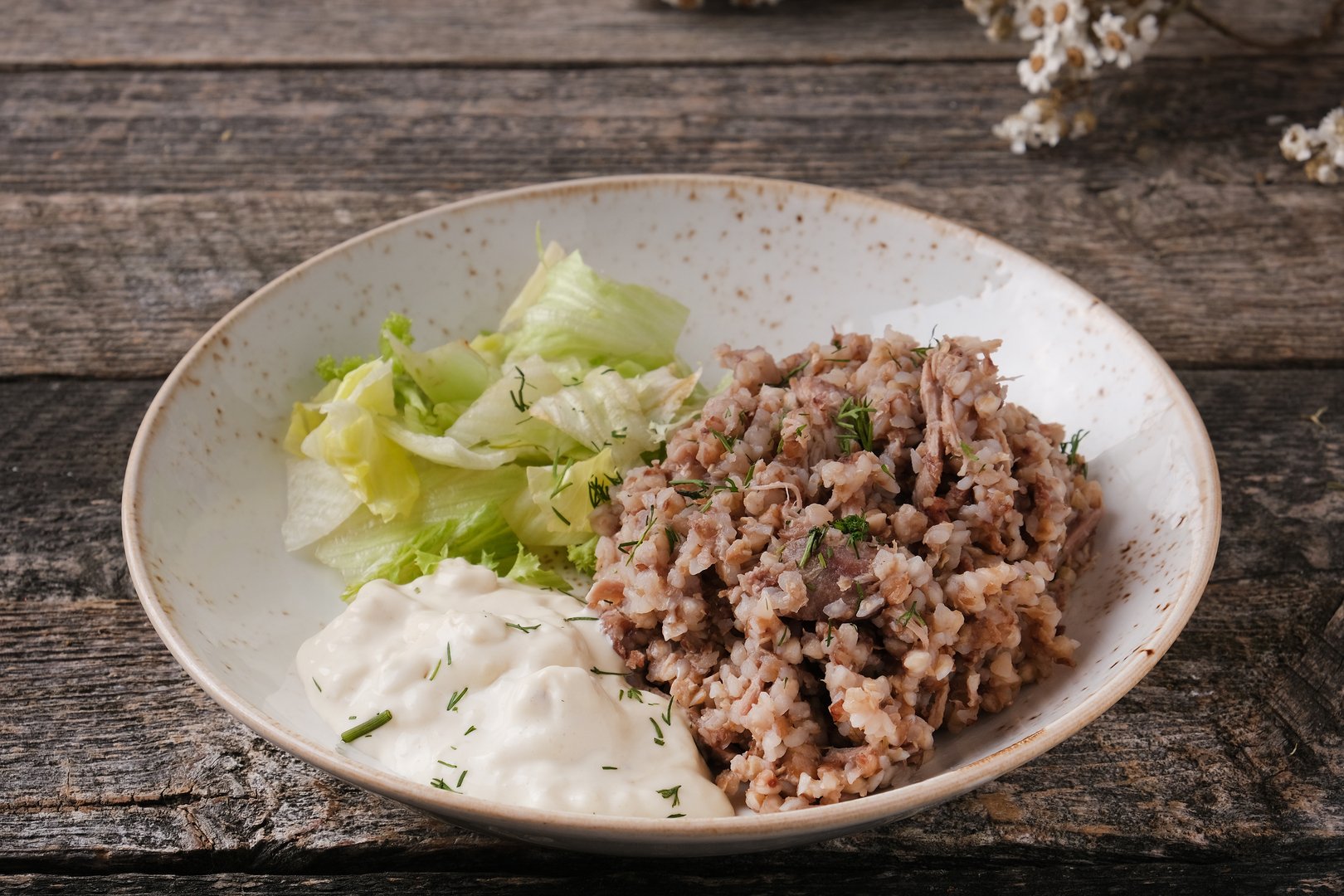 каша гречневая, мякоть утки, микс салатов СОУС: сливочный сыр, сливки, оливковое масло с ароматом Трюфеля, соевый соус